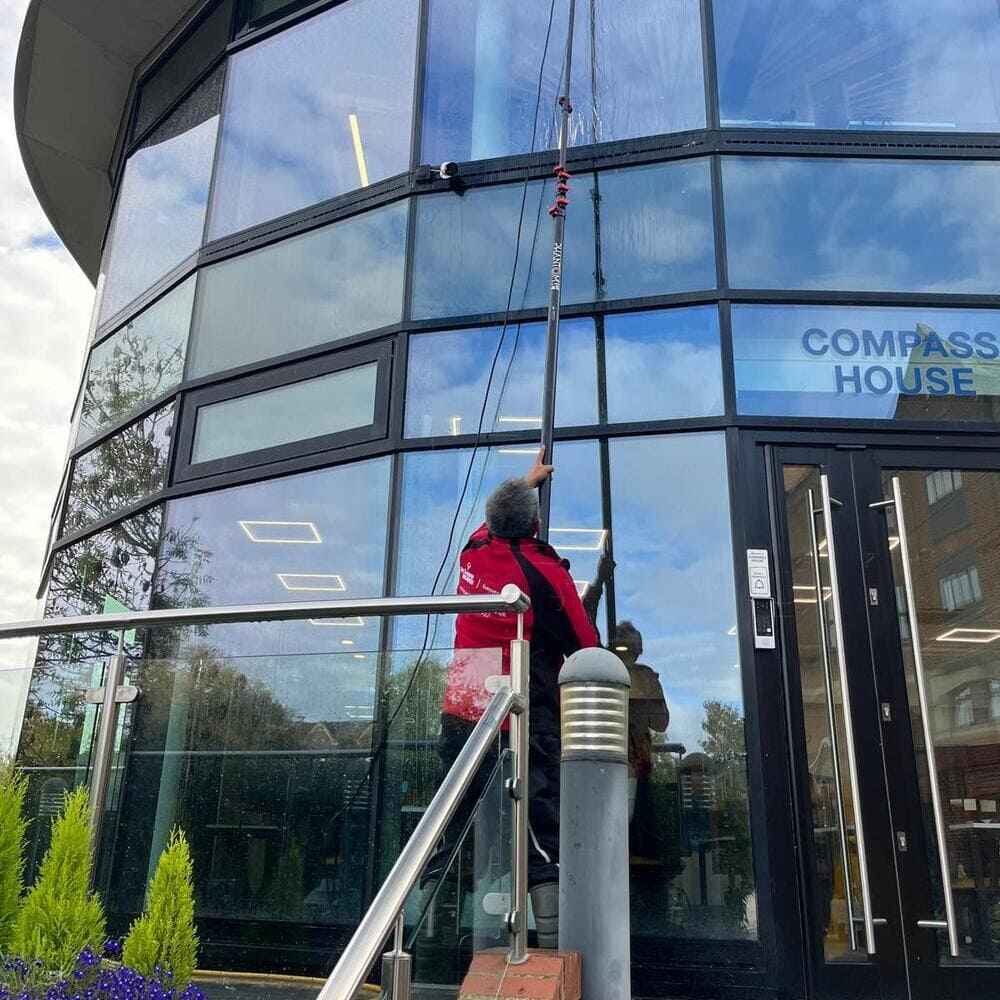 Yes. We use water-fed pole systems for buildings up to approximately four storeys, and appropriate access equipment for taller buildings. All work at height is carried out in full compliance with UK regulations.