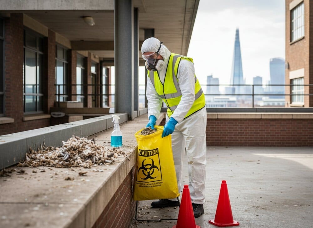 Removal of dead birds and other pest remains from loft spaces, roof voids, commercial premises, and external areas. Area decontaminated and sanitised following removal.